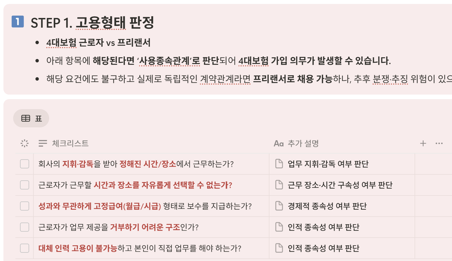 해당 인력이 4대보험 근로자로 채용되어야 하는지, 아니면 프리랜서(사업소득자) 계약이 가능한지를 점검합니다.