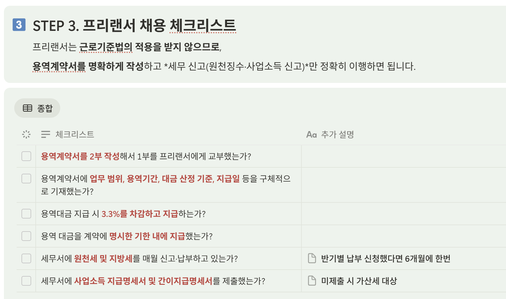 프리랜서는 근로기준법 적용 대상이 아니므로, 대신 세법과 민사법상 주요 점검 사항을 확인할 수 있도록 구성했습니다.